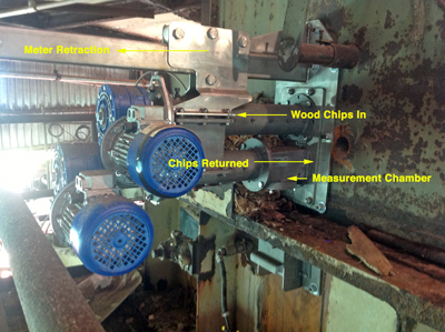 An Alabama Mill has installed an on-line Chip Moisture Analyzer for their batch digesters. It is installed in a conveyor transfer down shoot where the chips fall onto the sample collection screw (Figure 1) and get pulled into the analyzer. The microwave signal is enclosed in a square metal enclosure (Figure 2) which is continuously fed with refined chips using a small screw conveyor. A 4-20mA moisture signal is provided to the DCS for digester control. In the few weeks that the analyzer has been in operation, the mill has already realized that there is quite a bit of moisture variation in their softwood and hardwood chip feeds. This realtime information will greatly assist in optimizing the control of their digesters and save costs. Typical payback for this type of control optimization is counted in weeks rather than in months.